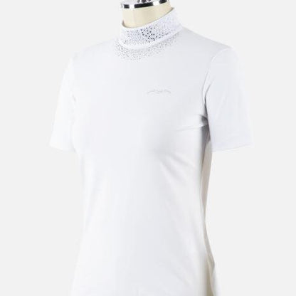 Animo Brasilia Women’s Competition Shirt features the most striking cluster of swarovski crystals cascading down the front of the collar reflects light, enhancing the garment with a unique and impactful elegance.