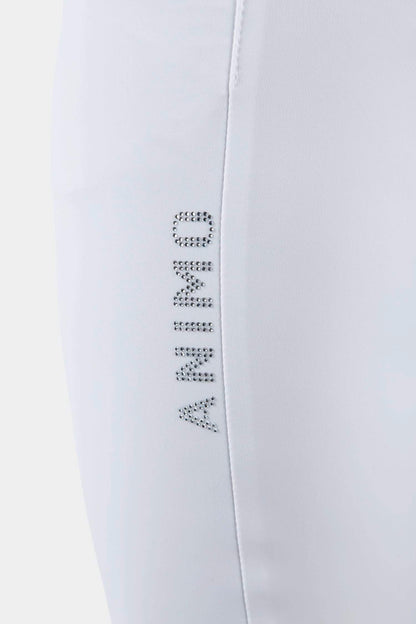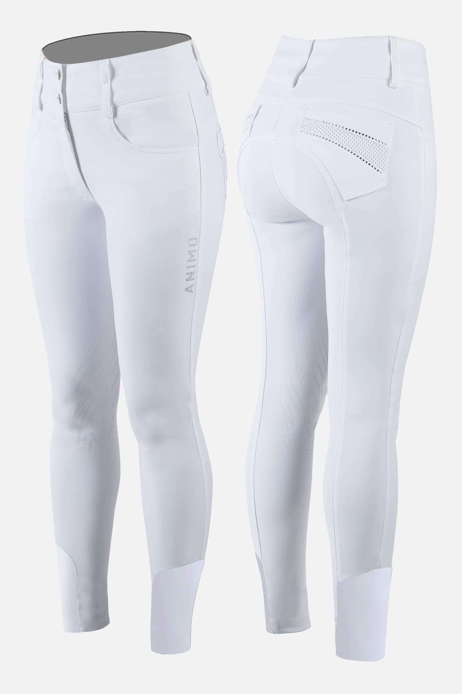 Women high waist equestrian pants with knee grip. Full grip option also available. The waist with two-button closure has belt loops at two different levels. The internal silicone strip helps to block the polo inside the pants. Back pockets with mesh inserts (white on white; black for other colours) and matching studs. The characteristic of the “Next” fabric is that its garments fit like a second skin, guaranteeing breathability and natural thermoregulation of the body. The enveloping fit enhances the silhouette. Push up effect. Rhinestone Albatross logo on the left leg. Classic design. FABRIC NEXT 72% Polyamide – 28% Elastan