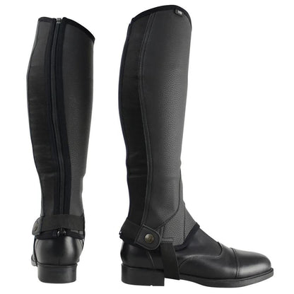 Durable, great everyday protection for your leg with these synthetic, leather effect chaps. With an elasticated panel for a snug fit, and an additional panel at the front to easily slide over your jodhpur boots. With a soft, fleece style lining for extra protection, and a strong elasticated press stud fastening around the ankle. These are extremely comfortable to ride in - you will almost forget you are wearing them!