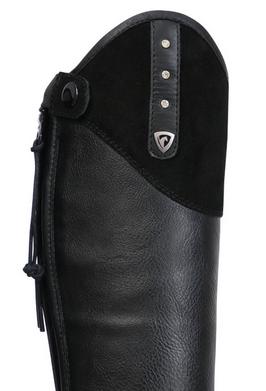 Designed using combination of real and synthetic leather, these boots are both supple and comfortable. The synthetic stretch leather closely hugs the contours of the calf with no restriction and the top suede panel features studs and the Hy Equestrian silver badge. These classy boots are finished with a breathable lining, hygienic insole, anti-skid sole, a press button spur guard and full length YKK zip.