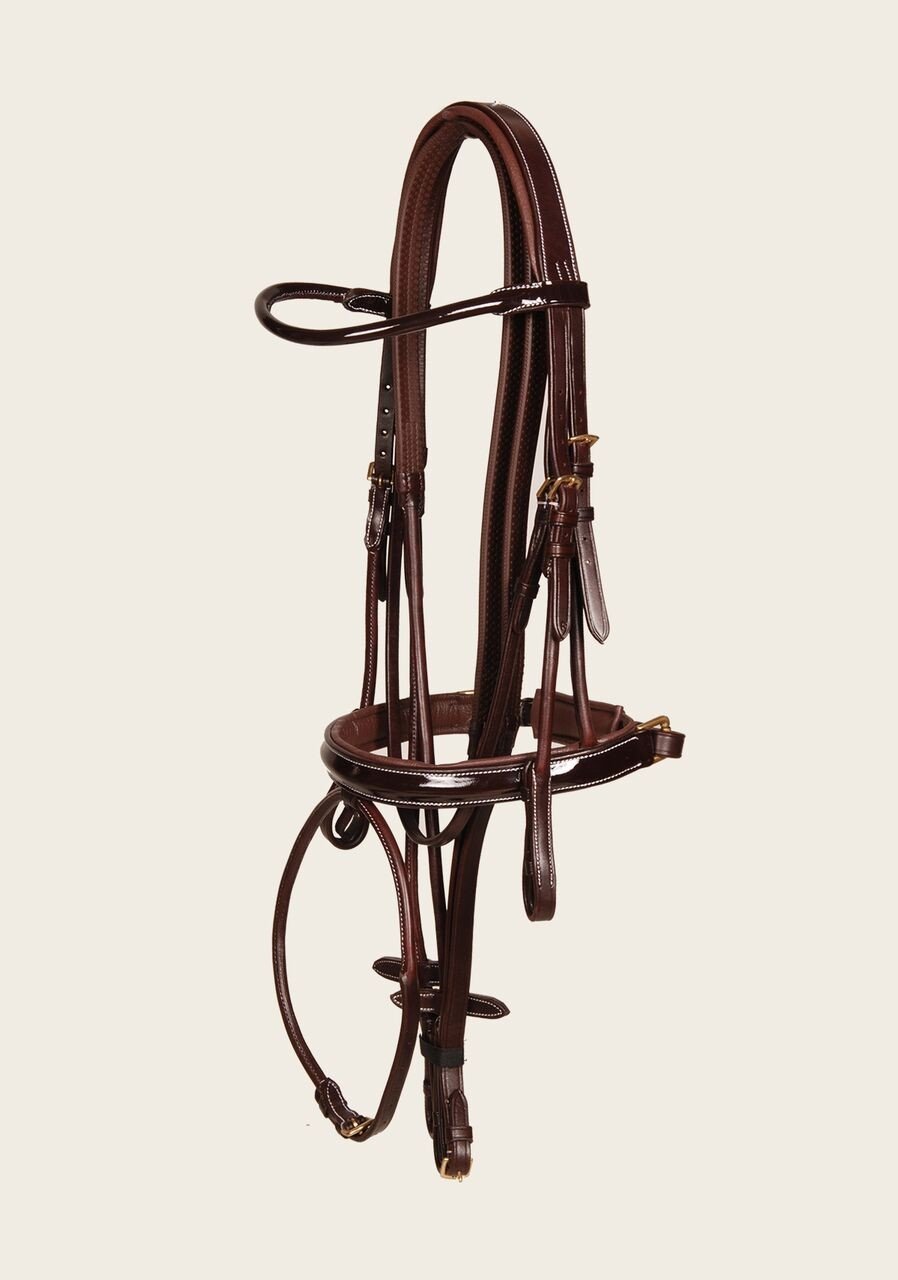 The Bijou Rolled Bridle is perfectly balanced by rolled bridle details and contrast patent leather details. The head piece is wonderfully padded for maximum poll comfort for your horse. The browband is completely rolled in a high quality patent leather with a matching patent leather inlay padded crank noseband. The drop noseband and reins have matching rolled leather inlays. A beautiful elegant bridle that catches the eye for it's perfect details and contrast stitching. This bridle is made from the highest quality Italian cow leather, finished with a custom Espoir pin. Available in a rich brown and black leather colour.