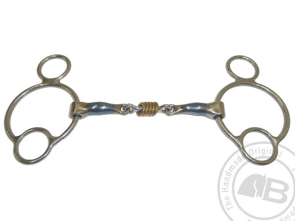 The Colin Miles is a great schooling bit with a wide center piece creating greater tongue pressure and reducing bar pressure. The rings give the horse something to play with and help keep the horses attention on the bit.