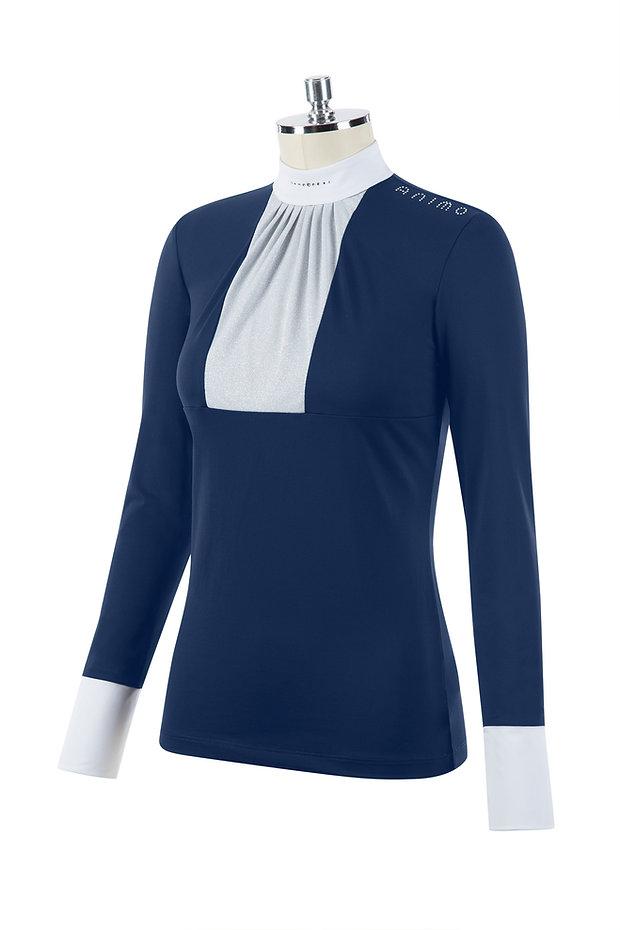 The shirt is made of top quality material, it wicks moisture to the outside and dries quickly, which makes it very comfortable to wear for many hours. The shirt has elegant white cuffs and a white collar additionally decorated with shiny rhinestones. On the shoulder there is the Animo logo lined with rhinestones.