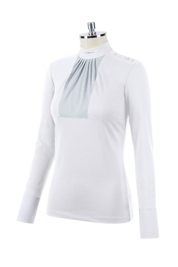 The shirt is made of top quality material, it wicks moisture to the outside and dries quickly, which makes it very comfortable to wear for many hours. The shirt has elegant white cuffs and a white collar additionally decorated with shiny rhinestones. On the shoulder there is the Animo logo lined with rhinestones.