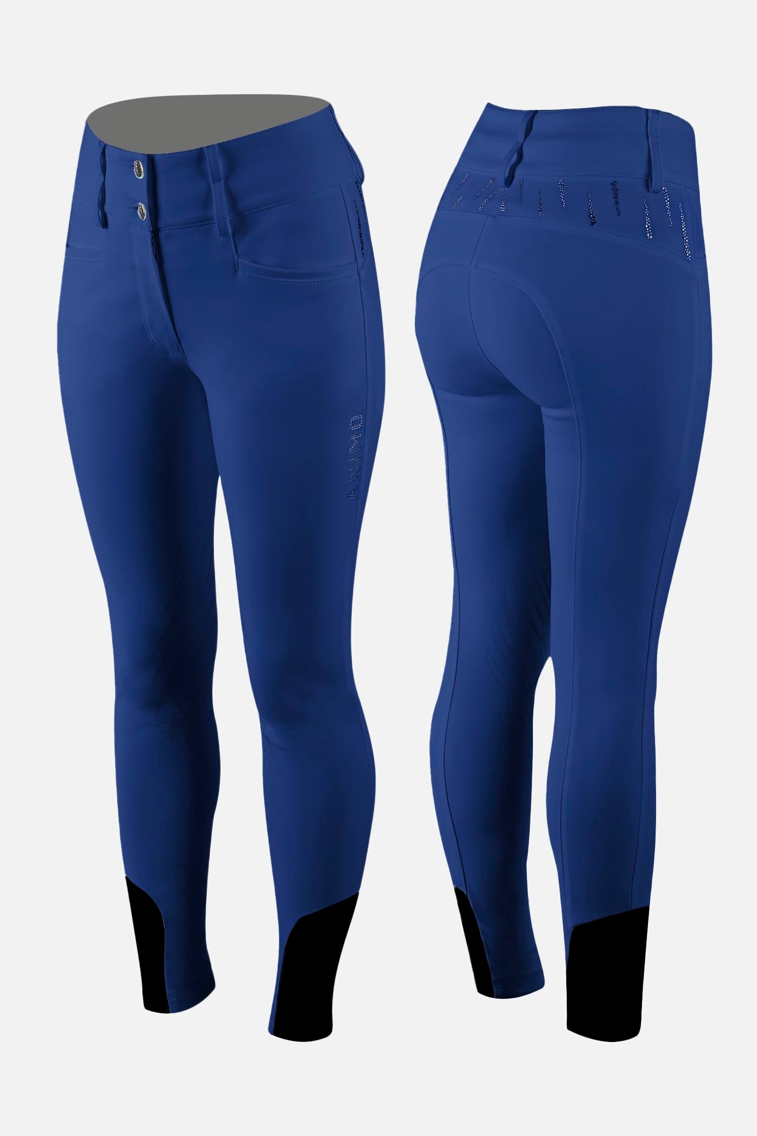 Women high-waist jewel breeches with knee grip. Rhinestone design on the back yoke. Two-button closure. The internal silicone strip helps to hold the polo inside the pants. Ankle cuffs in jersey. The characteristic of the “Next” fabric is that its garments fit like a second skin, guaranteeing breathability and natural thermoregulation of the body. The enveloping fit enhances the silhouette. Push up effect. Rhinestone Animo logo on the left leg. Design ‘Start Living’. Fabric NEXT 72% POLYAMIDE – 28% ELASTAN