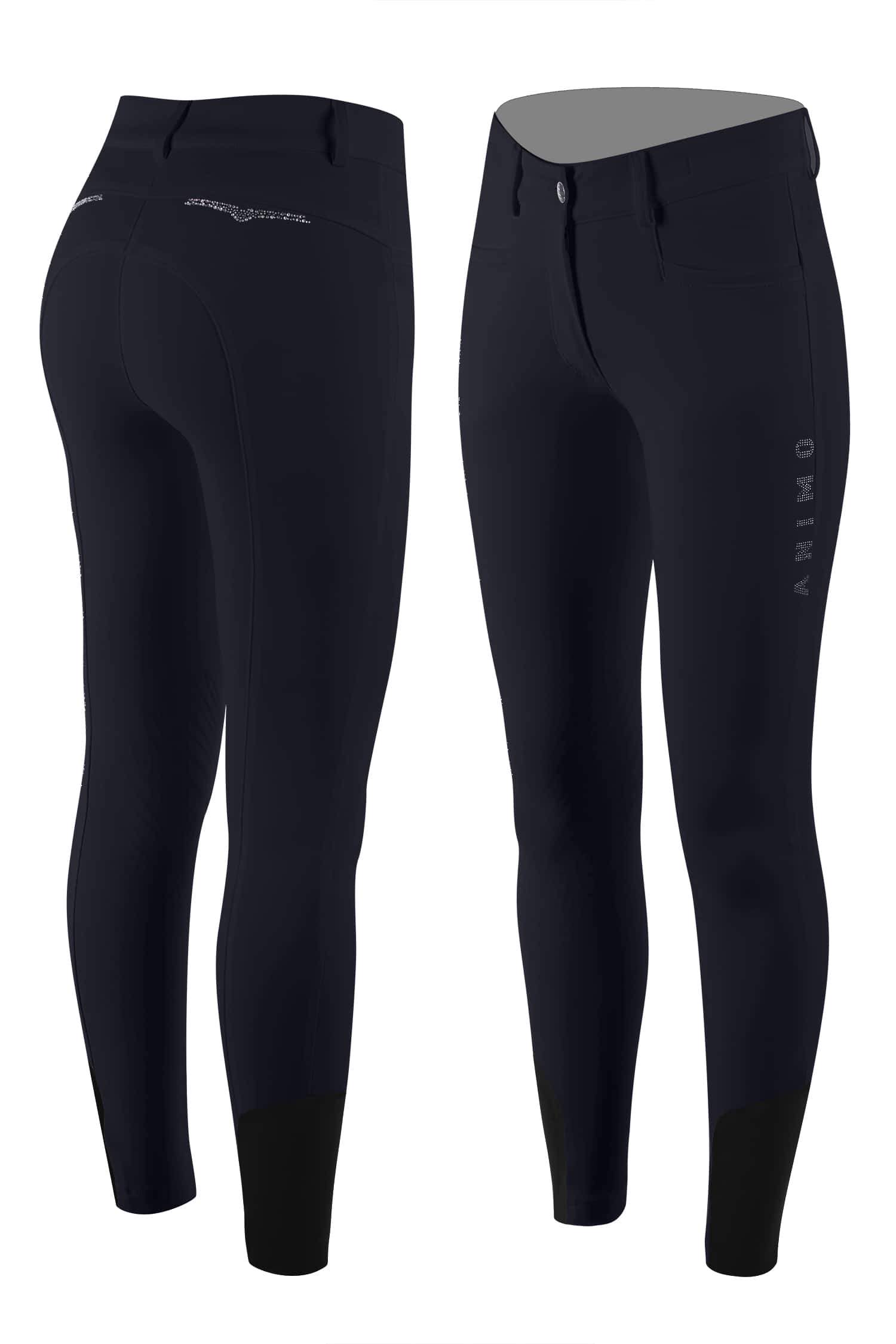 Elastic material adapts to the body contour and provides high wearing comfort.Animo Gripping System provides a secure hold in the saddle details of rhinestones on the back pockets and a logo lettering made of rhinestones make the breeches an eye-catcher in the stable and at competitions