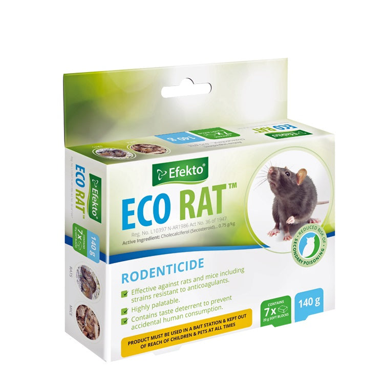 Efekto Eco Rat is a ready-to-use rodenticide soft block bait for the control of mice (Mus musculus), Norwegian or brown rats (Rattus norvegicus) and Roof rats (Rattus rattus) in and around buildings, including strains resistant to anticoagulants. 140 g (7 x 20 g soft blocks).
