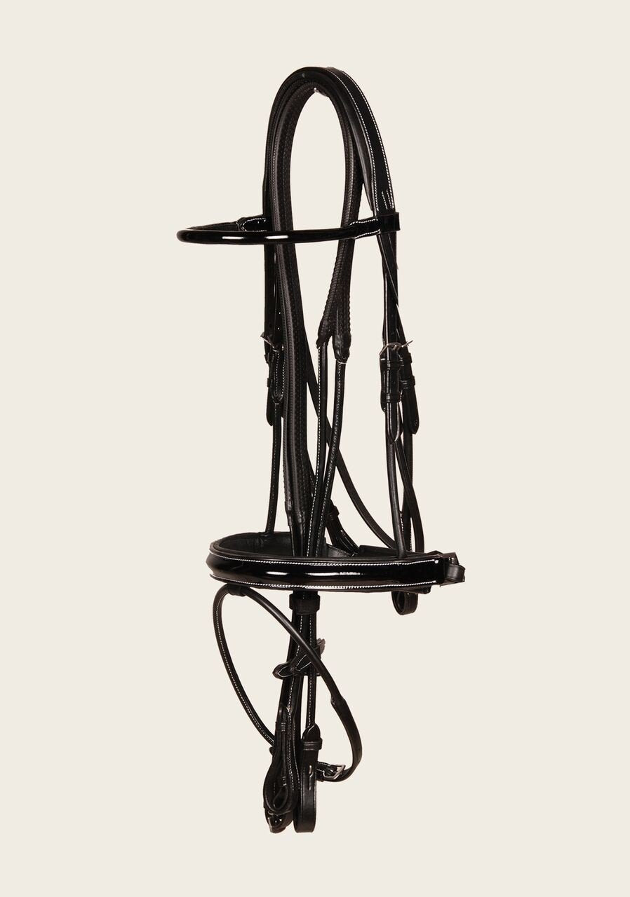 The Bijou Rolled Bridle is perfectly balanced by rolled bridle details and contrast patent leather details. The head piece is wonderfully padded for maximum poll comfort for your horse. The browband is completely rolled in a high quality patent leather with a matching patent leather inlay padded crank noseband. The drop noseband and reins have matching rolled leather inlays. A beautiful elegant bridle that catches the eye for it's perfect details and contrast stitching. This bridle is made from the highest quality Italian cow leather, finished with a custom Espoir pin. Available in a rich brown and black leather colour.