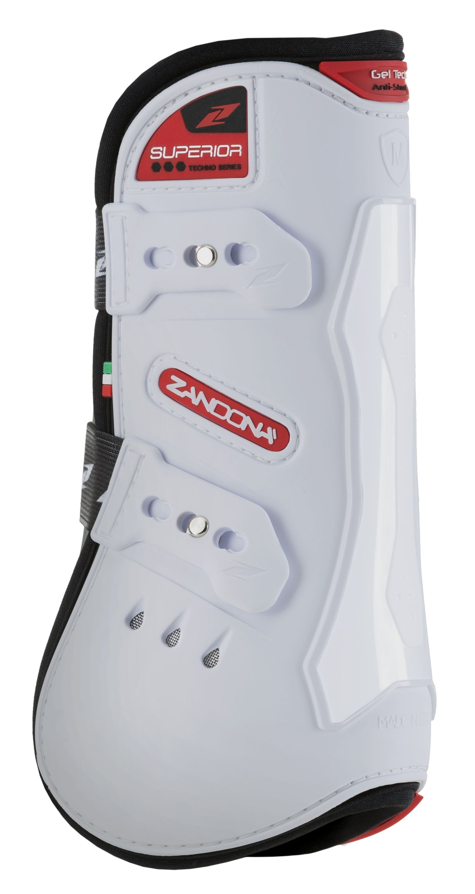 The 100% made in Italy "SUPERIOR AIR Fetlock" have been studied to defend jumping horses from collisions and bruises at hindlimb's fetlock and part of the cannon, while offering tendon support.