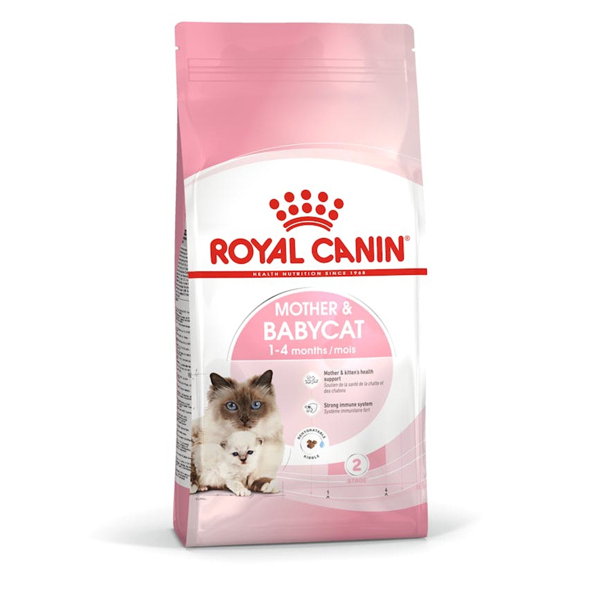 The Royal Canin Mother & Babycat Food is designed for queens during gestation and lactation - 1st age kittens from 1 to 4 months old. The very small cross-shaped kibble, with a texture adapted to the young kitten's jaw and primary teeth, is easily rehydrated to help the kitten transition from mother's milk to solid food.