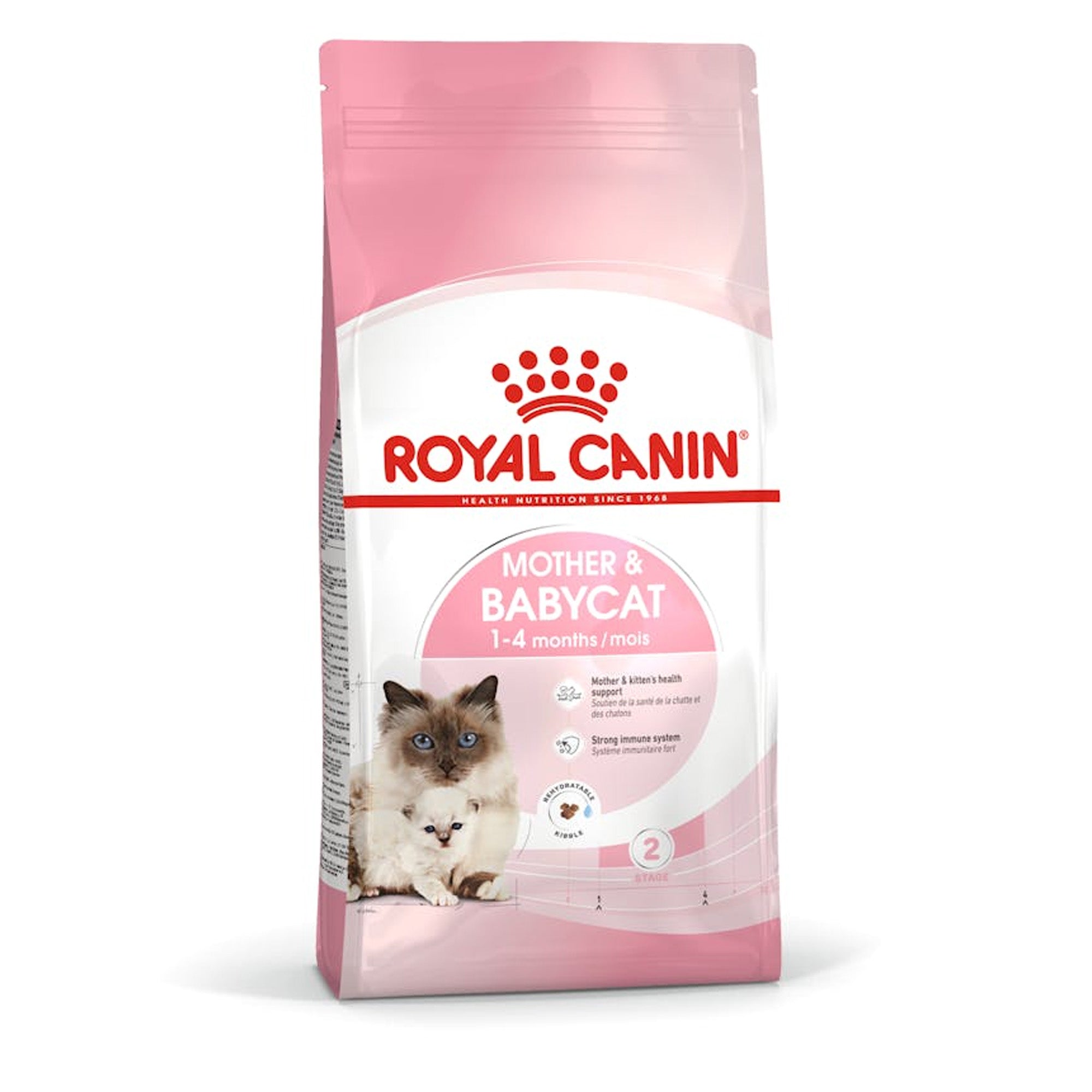 A balanced and complete feed for cats - specially for the mother and her kittens. 1st age kittens (from 1 to 4 months old) during weaning, also perfect for gestating and nursing queens atural Defences Support - Between 4 and 12 weeks after birth, the immunity transmitted by the mother decreases gradually. MOTHER & BABYCAT helps support the 1st age kitten’s natural defences thanks to prebiotics and a complex of antioxidants. Digestive Health - Extra-strenghthened digestive security. Special Easy Weaning - Weaning is the transition from milk to solid food. DHA - DHA helps support the kitten’s cerebral development during gestation and lactation.