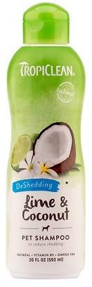 educe shedding and protect your dog's skin with TropiClean Lime & Coconut Deshedding Dog Shampoo. Human shampoo, even baby shampoo, can dry your dog's skin, causing itching and flaking. TropiClean Lime & Coconut Deshedding Dog Shampoo contains Omega 3 and 6 fatty acids to nourish your dog's skin. It also has pomegranate and awapuhi to help remove excess hair and eliminate tangles plus oatmeal and coconut for healthy skin. Inspired by the tropics, TropiClean Lime & Coconut Deshedding Dog Shampoo is soap-free and made with 70 percent organic ingredients for a natural clean.